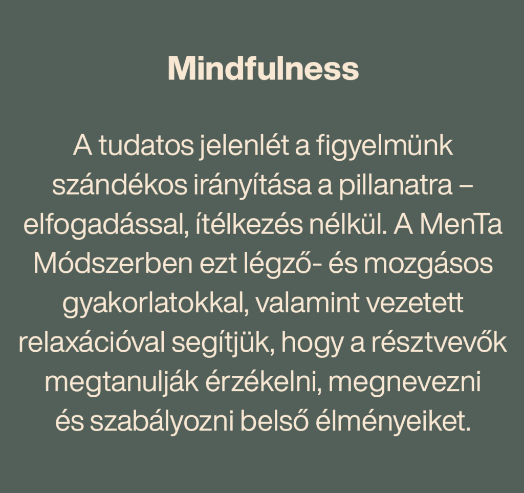 A Menta Módszer egy különleges, integrált megközelítést kínál a gyermekek és felnőttek érzelemszabályozásának és önismeretének fejlesztésében. Mi egyesítjük a klasszikus kognitív eszközöket, a mindfulness technikákat és a szomatikus fókuszú megoldásokat, hogy a gyerekek és a szülők számára egy teljes, hatékony és gyakorlati eszköztárat nyújtsunk. Miért van szükség mindhárom módszerre?